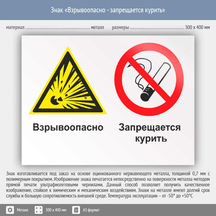 Знак «Взрывоопасно - запрещается курить», КЗ-06 на металле, размером 400х300 мм обозначает, что с повышенной взрывоопасностью в данном помещении, запрещается курить. Комбинированные знаки безопасности состоят из основных и дополнительных знаков с поясняющими надписями и предназначены для изложения комплексных требований, направленных на обеспечение безопасности