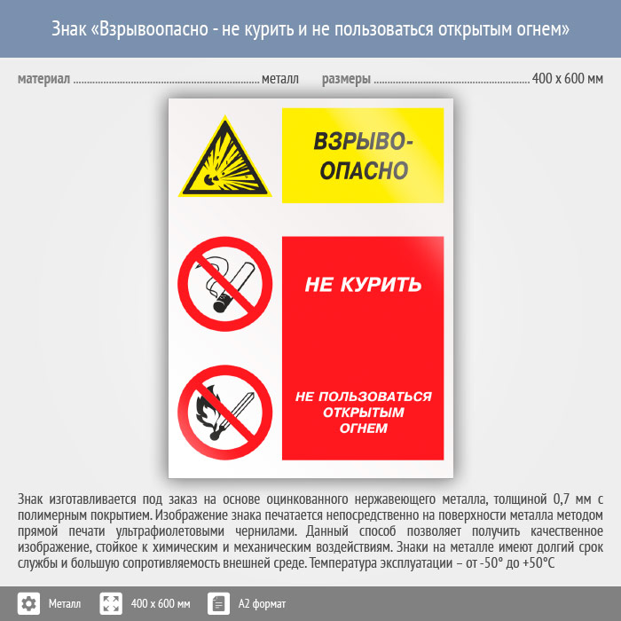 Знак «Взрывоопасно - не курить и не пользоваться открытым огнем», КЗ-08 на металле, размером 400х600 мм настоятельно не рекомендует курить, а тем более использовать огонь в данном помещении, в связи с повышенной взрывоопасностью. Комбинированные знаки безопасности состоят из основных и дополнительных знаков с поясняющими надписями и предназначены для изложения комплексных требований, направленных на обеспечение безопасности