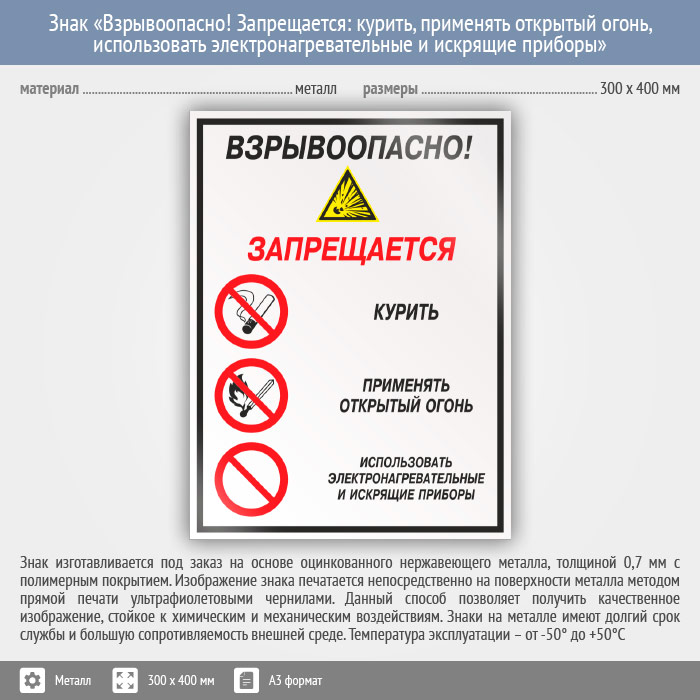 Знак «Взрывоопасно! Запрещается: курить, применять открытый огонь, использовать электронагревательные и искрящие приборы», КЗ-10 на металле, размером 300х400 мм запрещает курить, искрить, нагревать, зажигать, так как все это может просто взорвать. Комбинированные знаки безопасности состоят из основных и дополнительных знаков с поясняющими надписями и предназначены для изложения комплексных требований, направленных на обеспечение безопасности