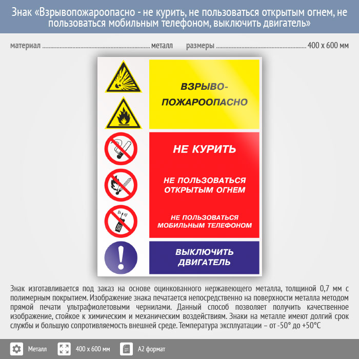 Знак «Взрывопожароопасно - не курить, не пользоваться открытым огнем, не пользоваться мобильным телефоном, выключить двигатель», КЗ-11 на металле, размером 400х600 мм предупреждает об опасности использования огня, в том числе курение и использование мобильных телефонов, актуален на АЗС. Комбинированные знаки безопасности состоят из основных и дополнительных знаков с поясняющими надписями и предназначены для изложения комплексных требований, направленных на обеспечение безопасности