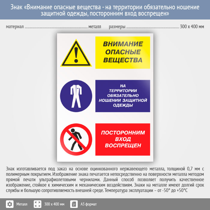 Знак «Внимание опасные вещества - на территории обязательно ношение защитной одежды, посторонним вход воспрещен», КЗ-15 на металле, размером 300х400 мм предупреждает об опасности и обязательном ношении средств защиты, а также запрещает посторонним находится на данной территории. Комбинированные знаки безопасности состоят из основных и дополнительных знаков с поясняющими надписями и предназначены для изложения комплексных требований, направленных на обеспечение безопасности