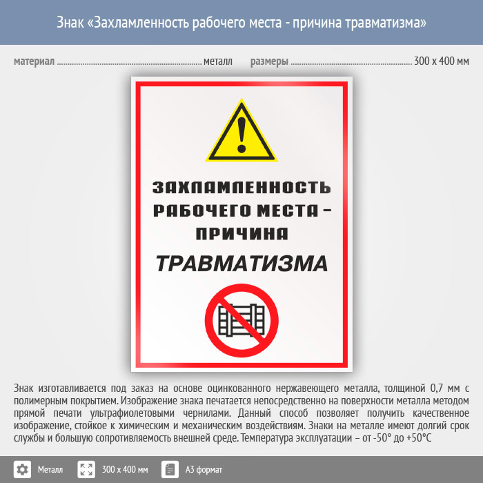 Знак «Захламленность рабочего места - причина травматизма», КЗ-21 на металле, размером 300х400 мм напоминает о содержании рабочего места в чистоте. Комбинированные знаки безопасности состоят из основных и дополнительных знаков с поясняющими надписями и предназначены для изложения комплексных требований, направленных на обеспечение безопасности