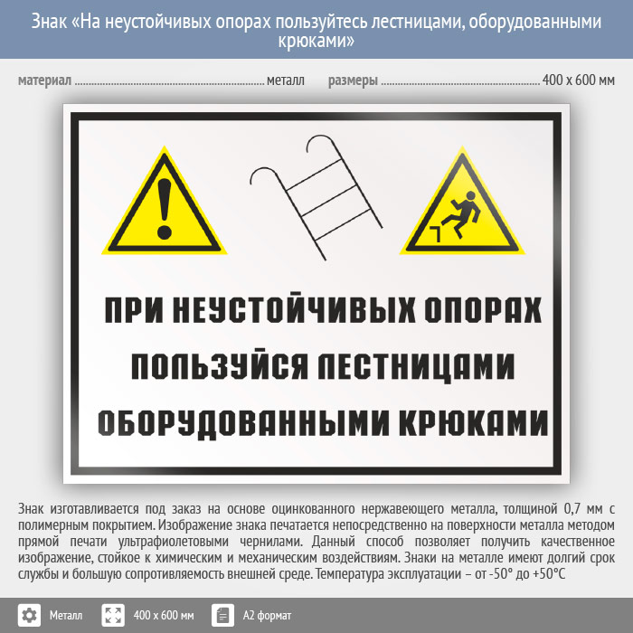 Знак «На неустойчивых опорах пользуйтесь лестницами, оборудованными крюками», КЗ-22 на металле, размером 600х400 мм напоминает о правилах работы с ненадежными опорами. Комбинированные знаки безопасности состоят из основных и дополнительных знаков с поясняющими надписями и предназначены для изложения комплексных требований, направленных на обеспечение безопасности