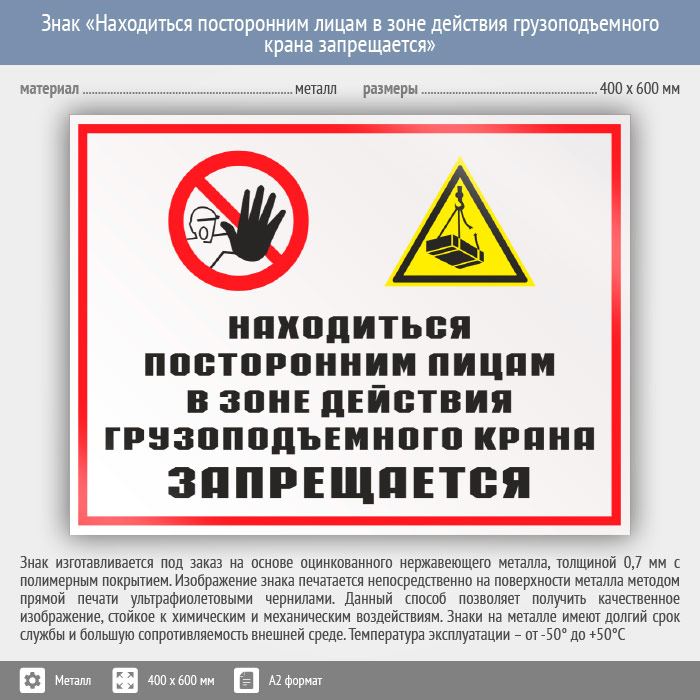Знак «Находиться посторонним лицам в зоне действия грузоподъемного крана запрещается», КЗ-23 на металле, размером 600х400 мм запрещает проход посторонних в зону действия крана, оно и понятно почему. Комбинированные знаки безопасности состоят из основных и дополнительных знаков с поясняющими надписями и предназначены для изложения комплексных требований, направленных на обеспечение безопасности