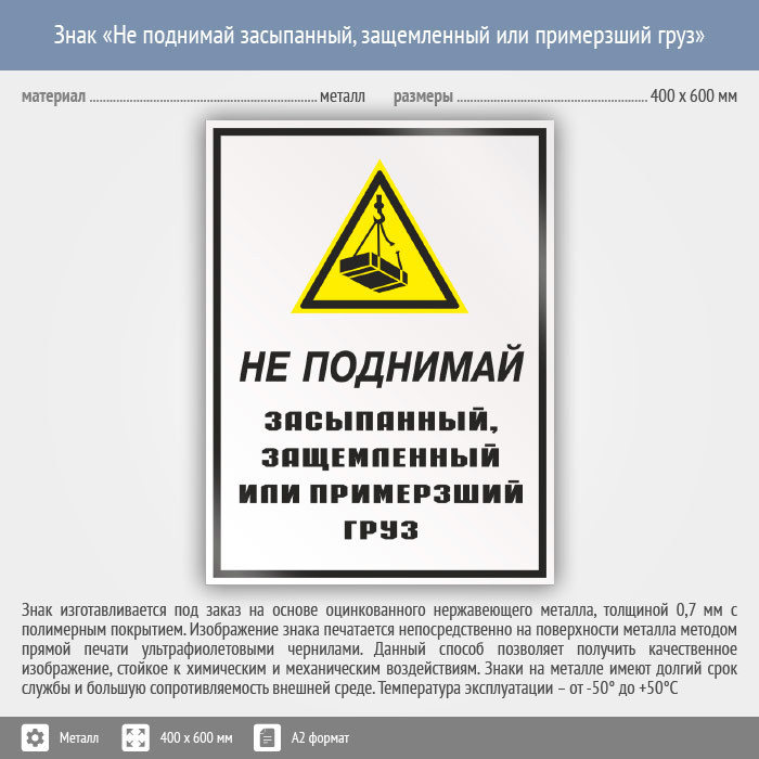 Знак «Не поднимай засыпанный, защемленный или примерзший груз», КЗ-27 на металле, размером 400х600 мм подсказывает, что работать с защемленным и примерзшим грузом опасно и нельзя. Комбинированные знаки безопасности состоят из основных и дополнительных знаков с поясняющими надписями и предназначены для изложения комплексных требований, направленных на обеспечение безопасности