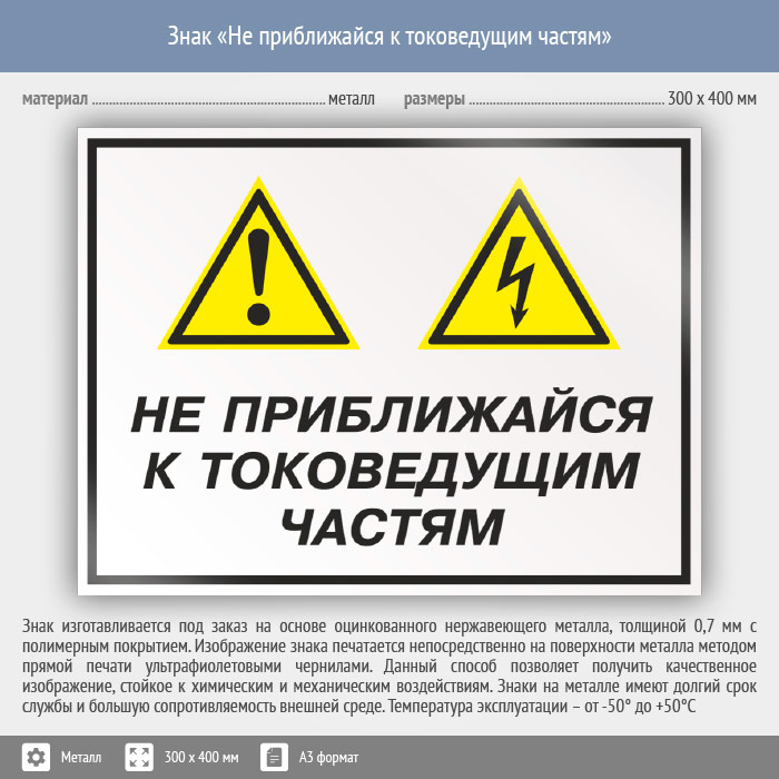 Знак «Не приближайся к токоведущим частям», КЗ-29 на металле, размером 400х300 мм напоминает об опасности поражения электрическим током. Комбинированные знаки безопасности состоят из основных и дополнительных знаков с поясняющими надписями и предназначены для изложения комплексных требований, направленных на обеспечение безопасности