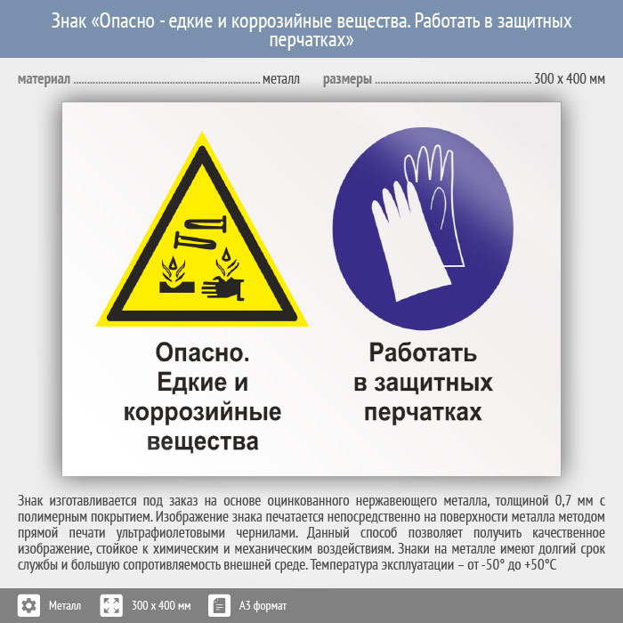 Знак «Опасно - едкие и коррозийные вещества. Работать в защитных перчатках», КЗ-36 на металле, размером 400х300 мм обозначает место, где используются едкие химические вещества и предписывает использовать средства защиты рук. Комбинированные знаки безопасности состоят из основных и дополнительных знаков с поясняющими надписями и предназначены для изложения комплексных требований, направленных на обеспечение безопасности