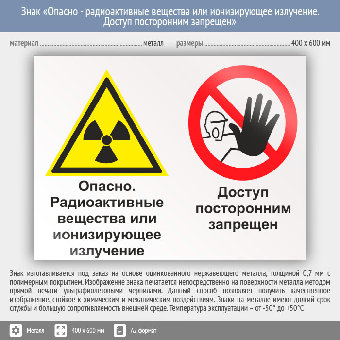 Знак «Опасно - радиоактивные вещества или ионизирующее излучение. Доступ посторонним запрещен», КЗ-41 на металле, размером 600х400 мм размещается в помещениях с радиоактивным излучением и запрещает доступ посторонних. Комбинированные знаки безопасности состоят из основных и дополнительных знаков с поясняющими надписями и предназначены для изложения комплексных требований, направленных на обеспечение безопасности