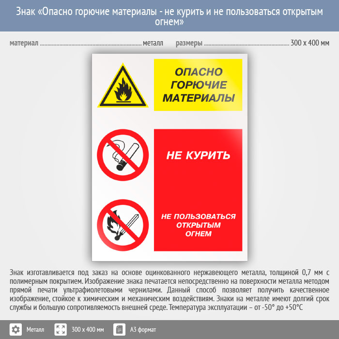 Знак «Опасно горючие материалы - не курить и не пользоваться открытым огнем», КЗ-45 на металле, размером 300х400 мм предупреждает об огнеопасности и запрещает использовать огонь и курить. Комбинированные знаки безопасности состоят из основных и дополнительных знаков с поясняющими надписями и предназначены для изложения комплексных требований, направленных на обеспечение безопасности