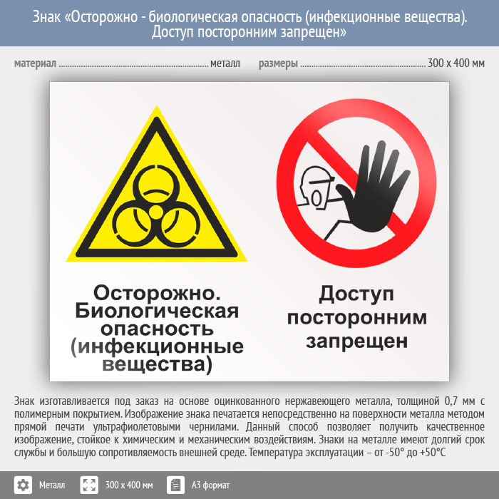 Знак «Осторожно - биологическая опасность (инфекционные вещества). Доступ посторонним запрещен», КЗ-51 на металле, размером 400х300 мм предупреждает о биологической опасности, запрещая посторонним находится на данной территории. Комбинированные знаки безопасности состоят из основных и дополнительных знаков с поясняющими надписями и предназначены для изложения комплексных требований, направленных на обеспечение безопасности