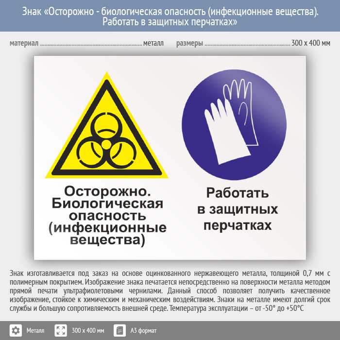 Знак «Осторожно - биологическая опасность (инфекционные вещества). Работать в защитных перчатках», КЗ-52 на металле, размером 400х300 мм предупреждает о биологической опасности, предписывая использование средств защиты рук. Комбинированные знаки безопасности состоят из основных и дополнительных знаков с поясняющими надписями и предназначены для изложения комплексных требований, направленных на обеспечение безопасности