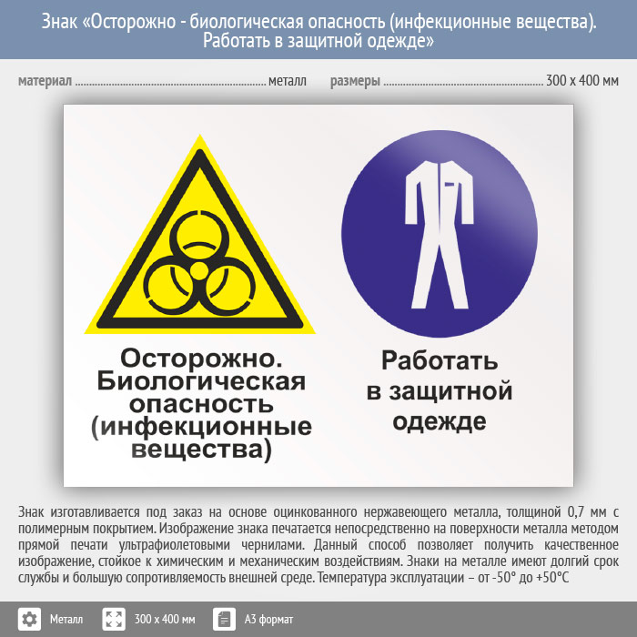 Знак «Осторожно - биологическая опасность (инфекционные вещества). Работать в защитной одежде», КЗ-53 на металле, размером 400х300 мм предупреждает об инфекционной опасности, предписывая использование средств индивидуальной защиты. Комбинированные знаки безопасности состоят из основных и дополнительных знаков с поясняющими надписями и предназначены для изложения комплексных требований, направленных на обеспечение безопасности