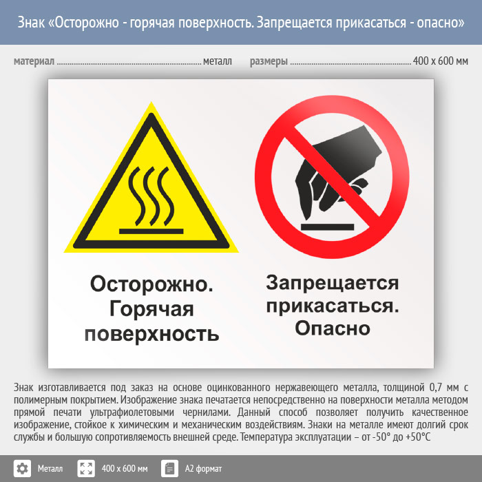 Знак «Осторожно - горячая поверхность. Запрещается прикасаться - опасно», КЗ-54 на металле, размером 600х400 мм предупреждает о возможности получения ожога при прикосновении к поверхности. Комбинированные знаки безопасности состоят из основных и дополнительных знаков с поясняющими надписями и предназначены для изложения комплексных требований, направленных на обеспечение безопасности