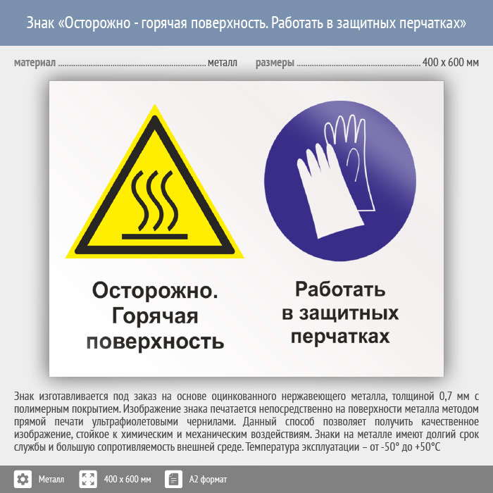 Знак «Осторожно - горячая поверхность. Работать в защитных перчатках», КЗ-55 на металле, размером 600х400 мм предписывает использование средств защиты рук и предупреждает об опасности при работе. Комбинированные знаки безопасности состоят из основных и дополнительных знаков с поясняющими надписями и предназначены для изложения комплексных требований, направленных на обеспечение безопасности