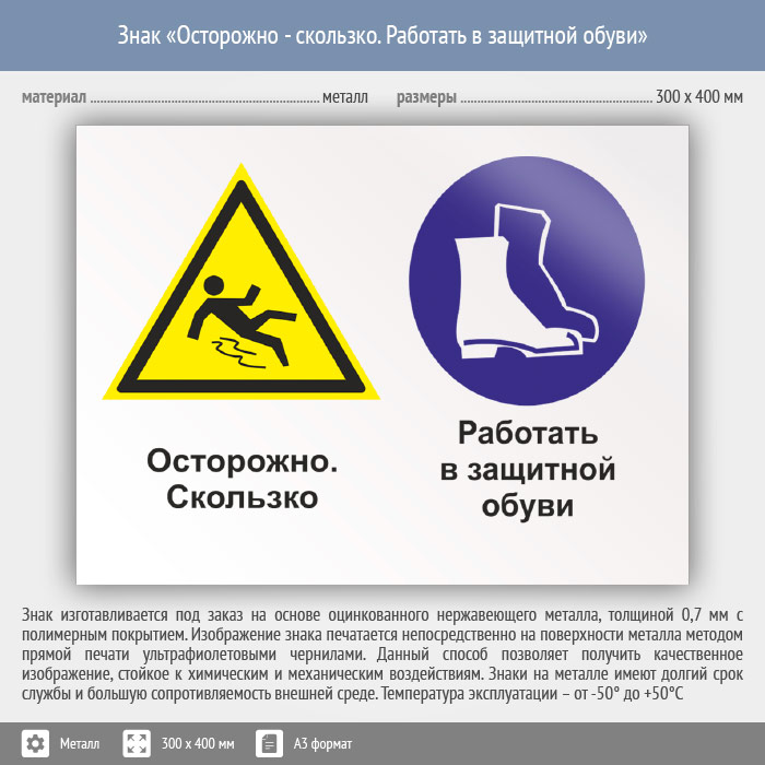 Знак «Осторожно - скользко. Работать в защитной обуви», КЗ-57 на металле, размером 400х300 мм предупреждает о скользкой поверхности и использовании специальной обуви. Комбинированные знаки безопасности состоят из основных и дополнительных знаков с поясняющими надписями и предназначены для изложения комплексных требований, направленных на обеспечение безопасности