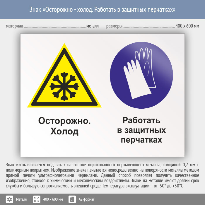 Знак «Осторожно - холод. Работать в защитных перчатках», КЗ-59 на металле, размером 600х400 мм предупреждает, что там – зима и использование рукавиц – обязательное требование. Комбинированные знаки безопасности состоят из основных и дополнительных знаков с поясняющими надписями и предназначены для изложения комплексных требований, направленных на обеспечение безопасности