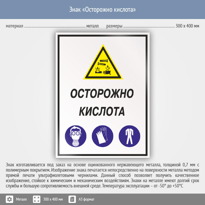 Знак «Осторожно кислота», КЗ-61 на металле, размером 300х400 мм предупреждает, о том, что здесь находится кислота. Комбинированные знаки безопасности состоят из основных и дополнительных знаков с поясняющими надписями и предназначены для изложения комплексных требований, направленных на обеспечение безопасности