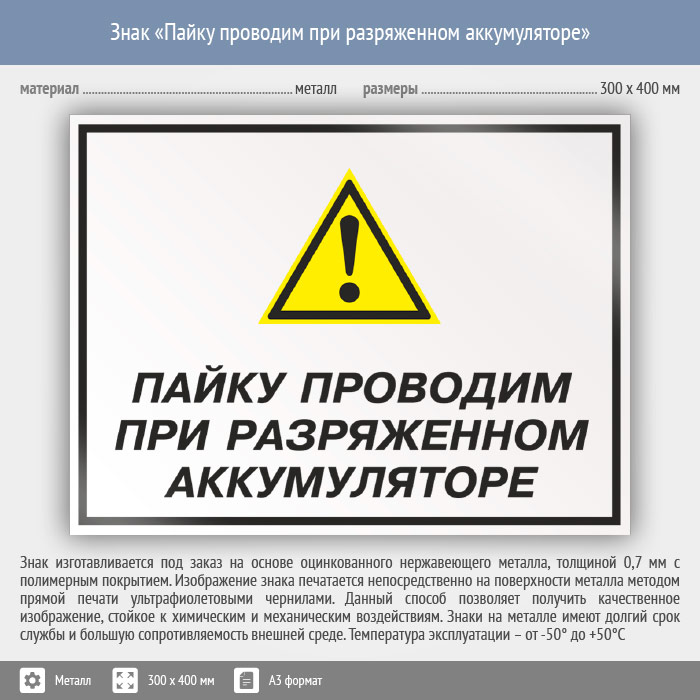 Знак «Пайку проводим при разряженном аккумуляторе», КЗ-62 (металл, 400х300 мм)