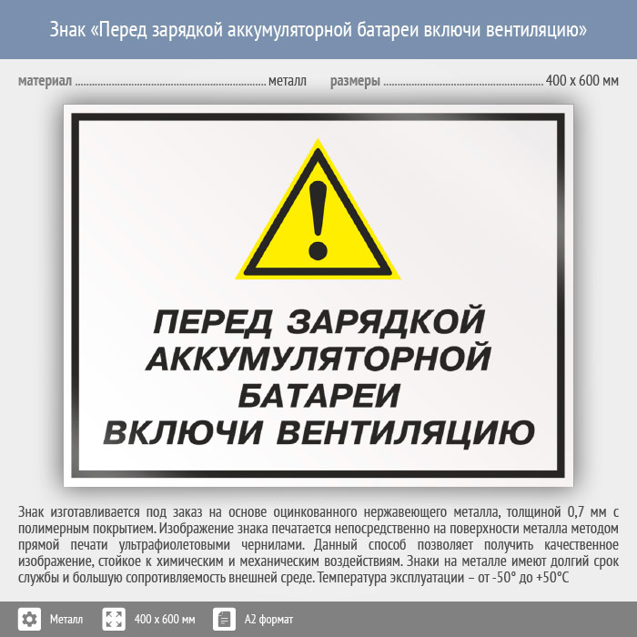 Знак «Перед зарядкой аккумуляторной батареи включи вентиляцию», КЗ-63 на металле, размером 600х400 мм напомнит о важности вентиляции при зарядке аккумулятора. Комбинированные знаки безопасности состоят из основных и дополнительных знаков с поясняющими надписями и предназначены для изложения комплексных требований, направленных на обеспечение безопасности