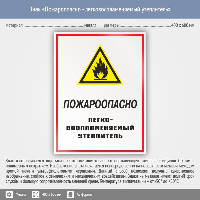 Знак «Пожароопасно - легковоспламеняемый утеплитель», КЗ-68 на металле, размером 400х600 мм предупреждает об огнеопасности используемого материала. Комбинированные знаки безопасности состоят из основных и дополнительных знаков с поясняющими надписями и предназначены для изложения комплексных требований, направленных на обеспечение безопасности