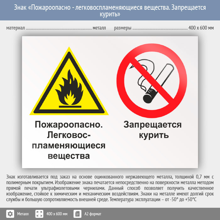 Знак «Пожароопасно - легковоспламеняющиеся вещества. Запрещается курить», КЗ-69 на металле, размером 600х400 мм размещается в местах использования горючих веществ и сообщает об опасности курения. Комбинированные знаки безопасности состоят из основных и дополнительных знаков с поясняющими надписями и предназначены для изложения комплексных требований, направленных на обеспечение безопасности