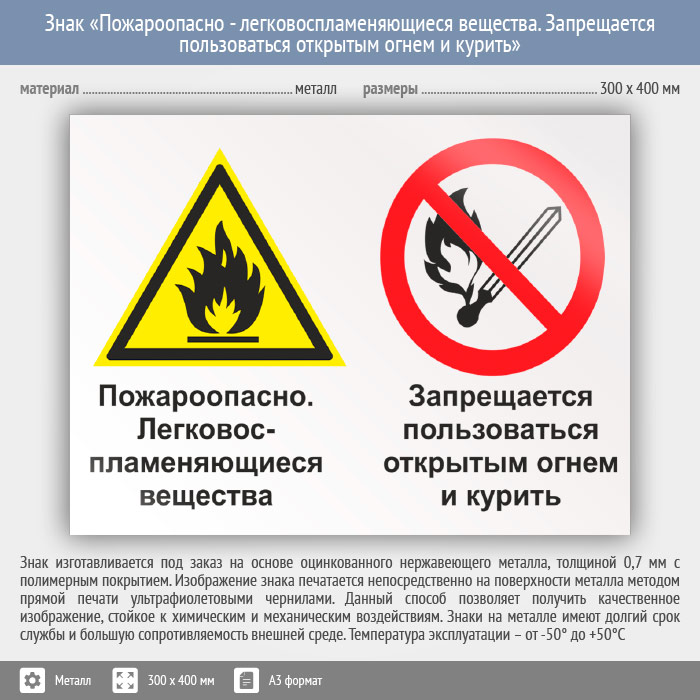 Знак «Пожароопасно - легковоспламеняющиеся вещества. Запрещается пользоваться открытым огнем и курить», КЗ-70 на металле, размером 400х300 мм размещается в местах использования горючих веществ и сообщает об опасности использования огня и курения. Комбинированные знаки безопасности состоят из основных и дополнительных знаков с поясняющими надписями и предназначены для изложения комплексных требований, направленных на обеспечение безопасности