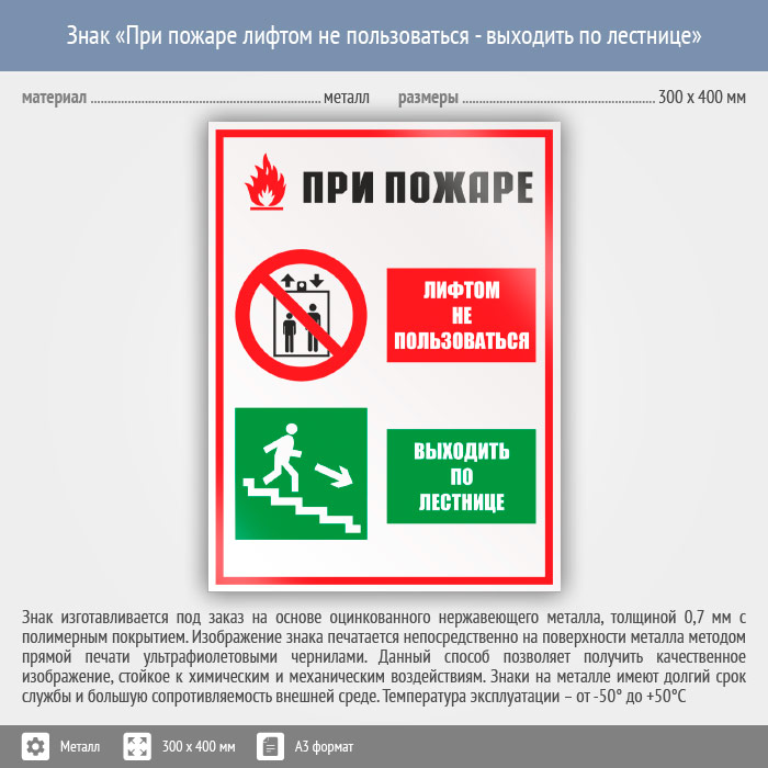 Знак «При пожаре лифтом не пользоваться - выходить по лестнице», КЗ-73 на металле, размером 300х400 мм напомнит об опасности использования лифта во время пожара. Комбинированные знаки безопасности состоят из основных и дополнительных знаков с поясняющими надписями и предназначены для изложения комплексных требований, направленных на обеспечение безопасности