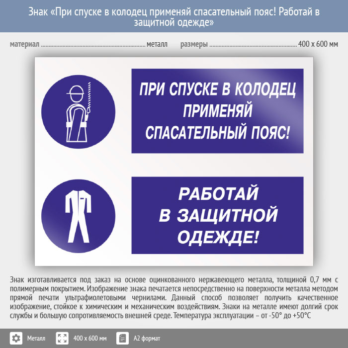 Знак «При спуске в колодец применяй спасательный пояс! Работай в защитной одежде», КЗ-76 на металле, размером 600х400 мм предупреждает о важности использования страховочного пояса и защитной одежды. Комбинированные знаки безопасности состоят из основных и дополнительных знаков с поясняющими надписями и предназначены для изложения комплексных требований, направленных на обеспечение безопасности