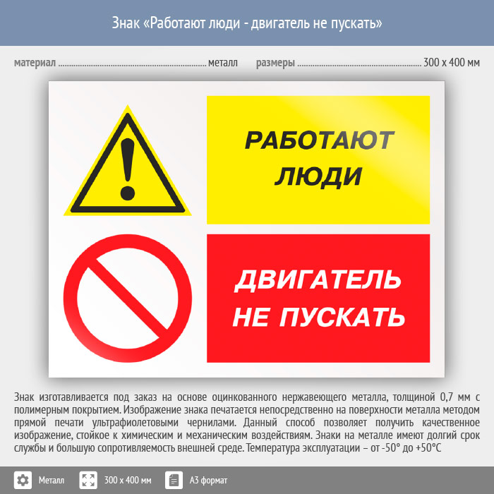 Знак «Работают люди - двигатель не пускать», КЗ-82 на металле, размером 400х300 мм сообщает, что здесь, возможно, работают люди и запуск двигателя производить запрещено. Комбинированные знаки безопасности состоят из основных и дополнительных знаков с поясняющими надписями и предназначены для изложения комплексных требований, направленных на обеспечение безопасности
