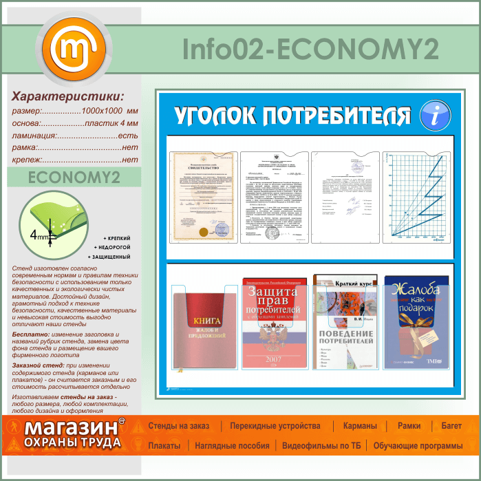 Стенд «Уголок потребителя» состоит из 4 плоских карманов А4 формата книжного (вертикального) расположения для размещения информации покупателю, а также из 4-х объемных карманов А4 формата для размещения книги жалоб и предложений, брошюры для покупателей и потребителей…