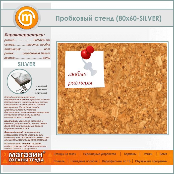Пробковая доска, размером 80х60 см – отличное решение для размещения сменной информации. Основное достоинство пробковой доски – это оперативная и удобная смена информации, ведь вам понадобятся только руки и канцелярские кнопки. Еще одним несомненным плюсом является возможность использования любого формата бумаги, чего не скажешь о карманах. Часто на таких стендах размещают контактные данные, образцы заполняемых бланков, график работы, порядок приема документов в организации и прочее