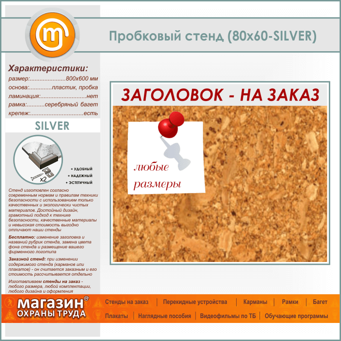 Пробковая доска с заголовком, размером 80х60 см – отличное решение для размещения сменной информации. Основное достоинство пробковой доски – это оперативная и удобная смена информации, ведь вам понадобятся только руки и канцелярские кнопки. Еще одним несомненным плюсом является возможность использования любого формата бумаги, чего не скажешь о карманах. Часто на таких стендах размещают контактные данные, образцы заполняемых бланков, график работы, порядок приема документов в организации и прочее