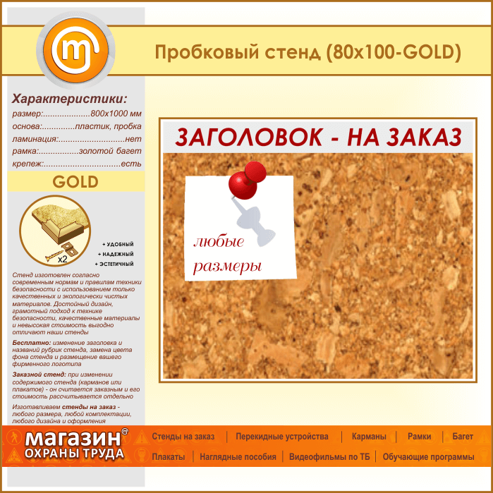 Пробковая доска с заголовком, размером 100х80 см – отличное решение для размещения сменной информации. Основное достоинство пробковой доски – это оперативная и удобная смена информации, ведь вам понадобятся только руки и канцелярские кнопки. Еще одним несомненным плюсом является возможность использования любого формата бумаги, чего не скажешь о карманах. Часто на таких стендах размещают контактные данные, образцы заполняемых бланков, график работы, порядок приема документов в организации и прочее