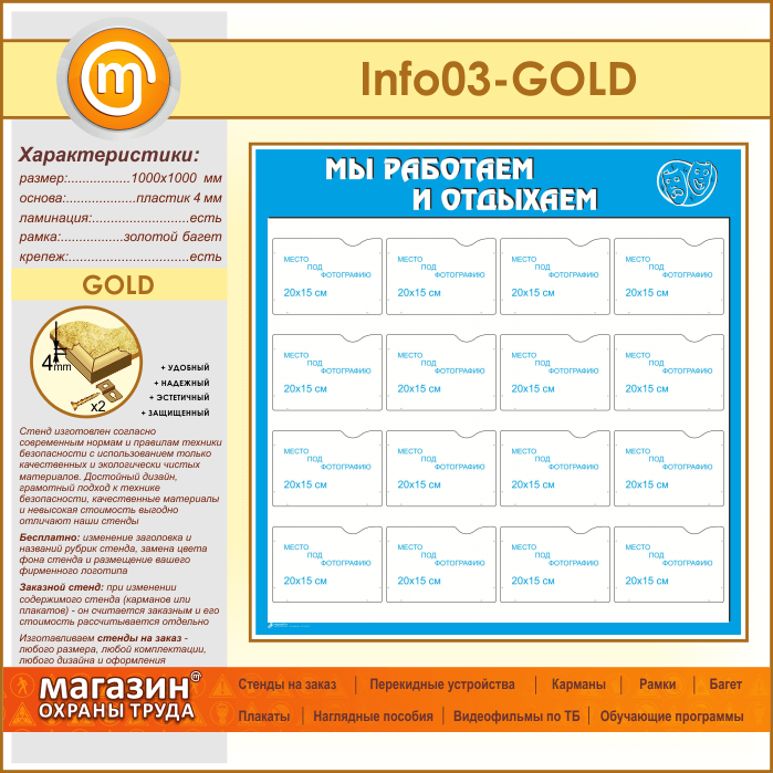 Стенд «Мы работаем и отдыхаем» с 16 карманами А5 формата (IN-03-GOLD)