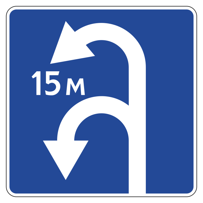 Знаком обозначают протяженность зоны для разворота. Дорожный знак 6.3.2 устанавливают на дорогах с разделительной полосой перед местом разворота на разделительной полосе, на дорогах без разделительной полосы - над крайней левой полосой движения в данном направлении. Знак допускается устанавливать справа на дорогах с числом полос для движения в данном направлении не более трех. В этом случае применяют предварительный знак с табличкой 8.1.1 на расстоянии 100-150 м до основного знака