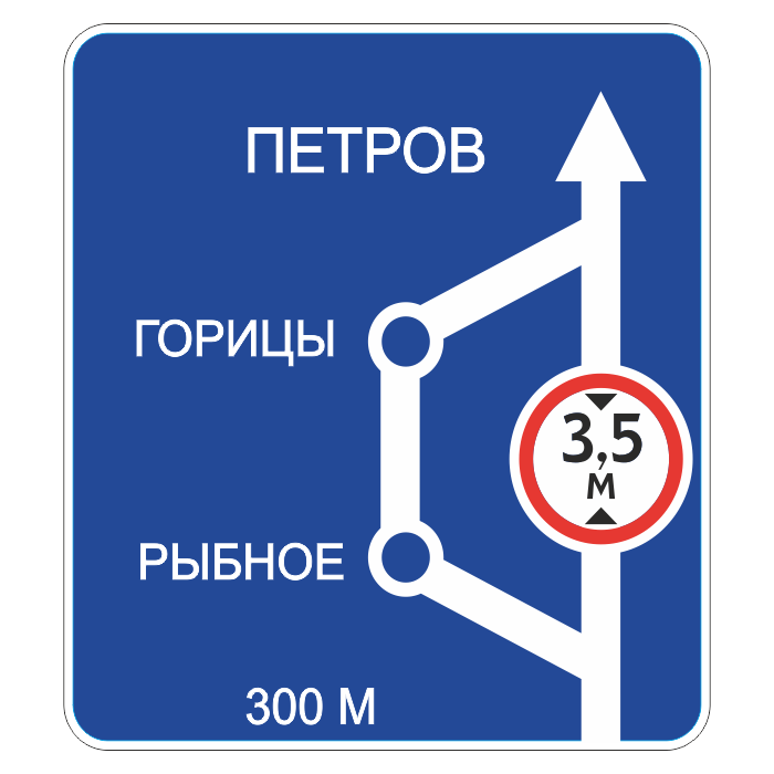 Знак отражает направления движения к обозначенным на знаке населенным пунктам и другим объектам. Дорожный знак 6.9.1 устанавливают вне населенных пунктов на расстоянии 300-500 м перед пересечением или началом полосы торможения, в населенных пунктах на расстоянии 50-100 м. На автомагистралях устанавливают предварительный знак на расстоянии 800-1000 м перед пересечением или началом полосы торможения. Знак допускается устанавливать над проезжей частью и на разделительной полосе. Цена указана за 1 м2