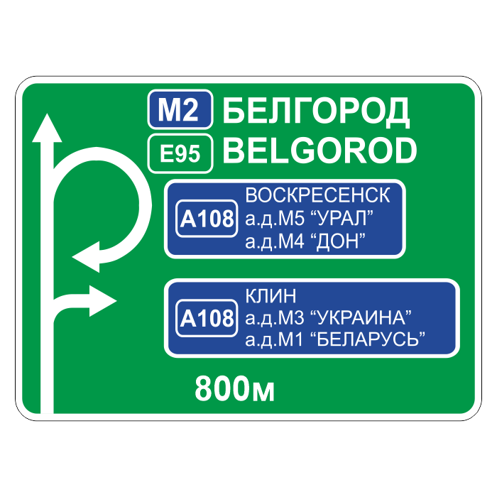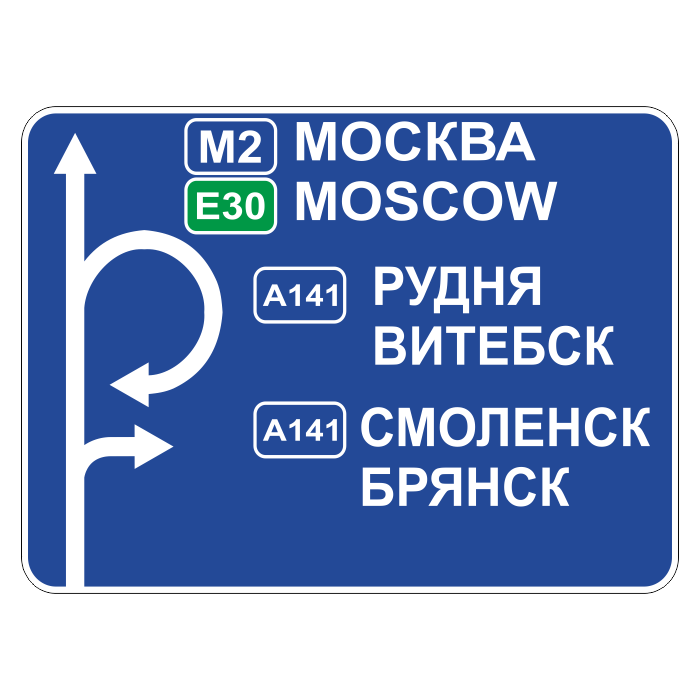 Знак отражает направления движения к обозначенным на знаке населенным пунктам и другим объектам. Дорожный знак 6.9.1 устанавливают вне населенных пунктов на расстоянии 300-500 м перед пересечением или началом полосы торможения, в населенных пунктах на расстоянии 50-100 м. На автомагистралях устанавливают предварительный знак на расстоянии 800-1000 м перед пересечением или началом полосы торможения. Знак допускается устанавливать над проезжей частью и на разделительной полосе. Цена указана за 1 м2