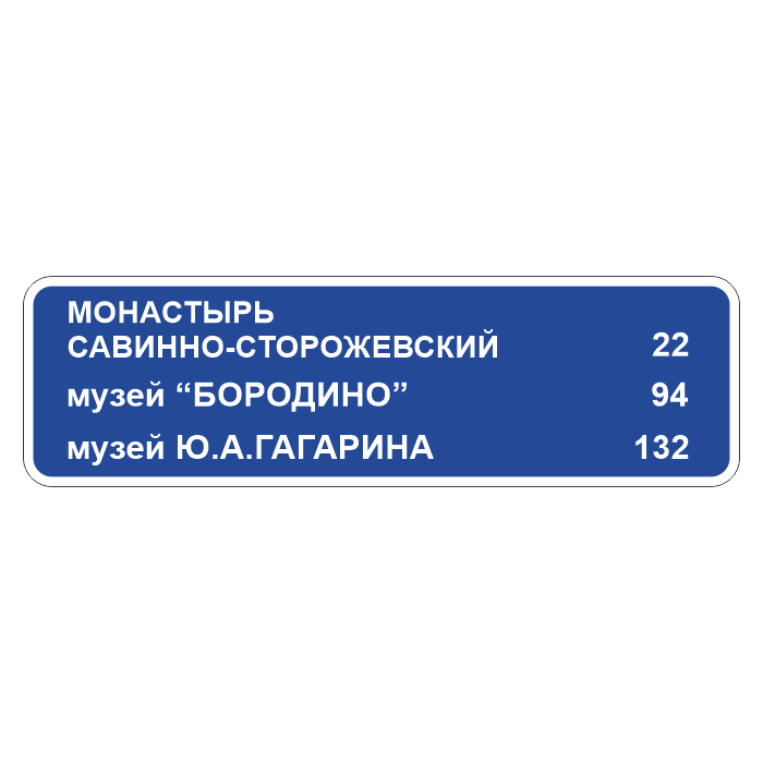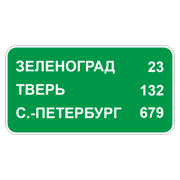 Данный знак применяют для указания расстояний до фактической границы застройки населенных пунктов или других объектов, расположенных на маршруте. Знак на дорогах вне населенных пукктов устанавливают на выездах из городов и других крупных населенных пунктов, после пересечений в разных уровнях, после сложных перекрестков, а на участках дорог между ними - не реже чем через 20 км. Цена указана за 1 м2