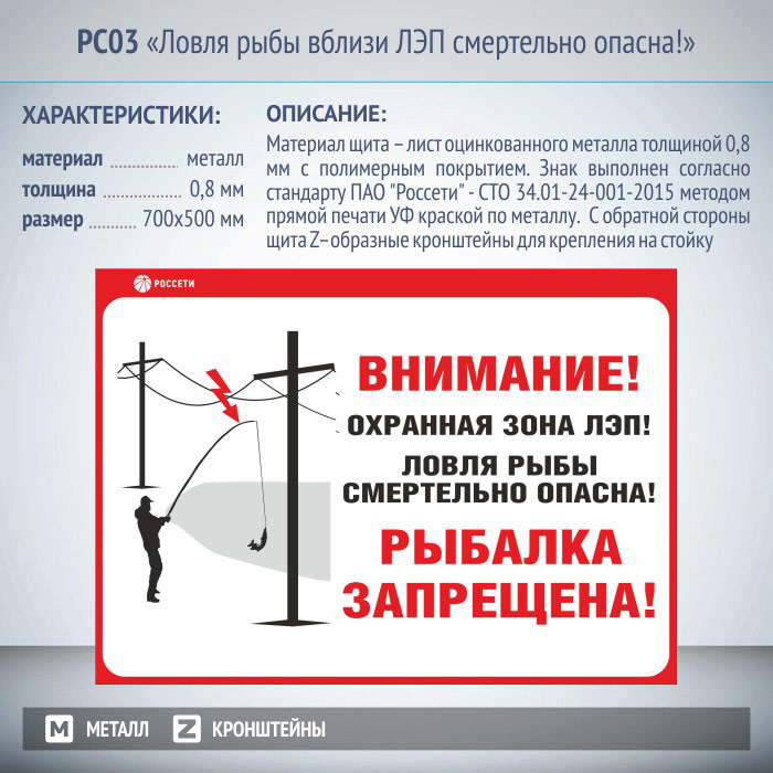Информационные щиты «Ловля рыбы вблизи ЛЭП смертельно опасна!» выполнены согласно стандарта ПАО «Россети» – СТО 34.01-24-001-2015 методом прямой печати УФ краской по оцинкованному металлу (толщиной 0,8 мм с полимерным покрытием). Размеры щитов – 700×500 мм. С обратной стороны щита находятся Z–образные кронштейны для крепления на стойку. Также есть версии без отверстий