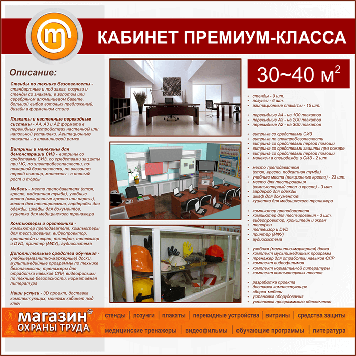 Предлагаем на выбор три класса кабинетов по охране труда на 30-40 кв.м. - эконом, бизнес и премиум