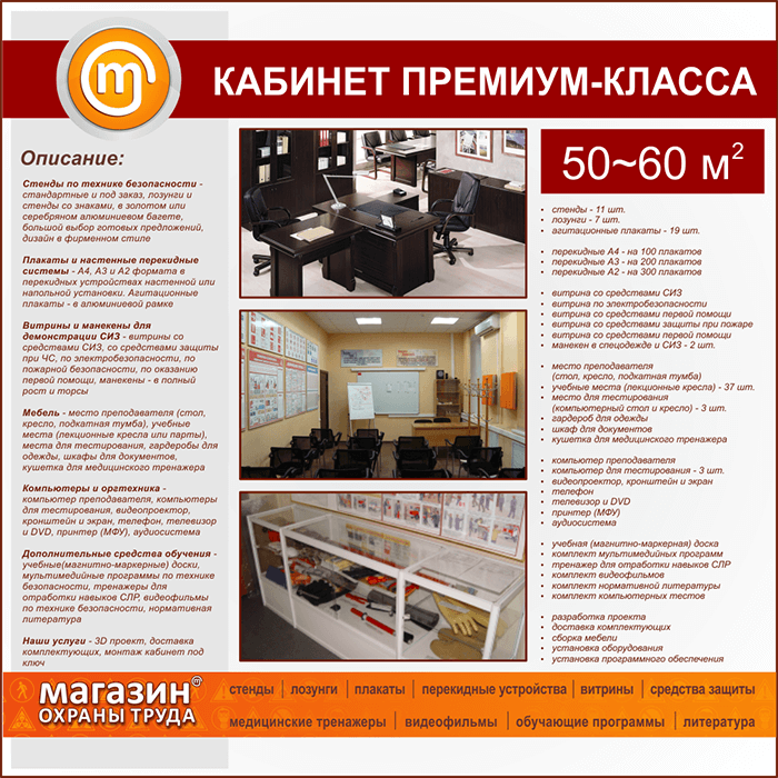 Предлагаем на выбор три класса кабинетов по охране труда на 50-60 кв.м. - эконом, бизнес и премиум