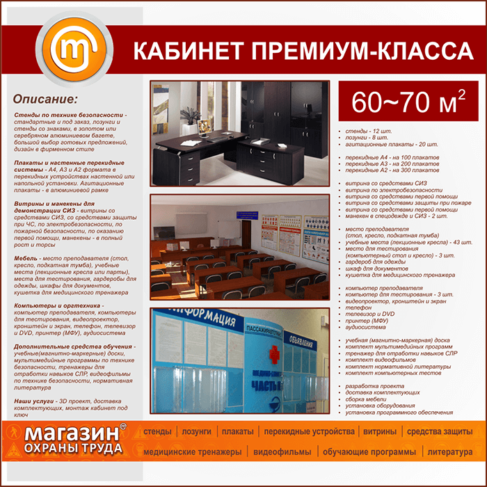 Предлагаем на выбор три класса кабинетов по охране труда на 60-70 кв.м. - эконом, бизнес и премиум