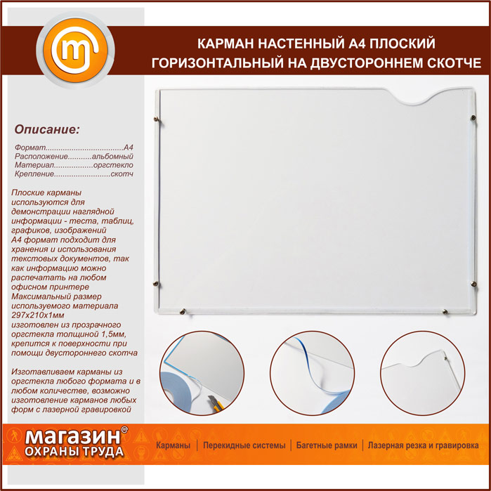 Карман настенный А4 плоский горизонтальный на двустороннем скотче