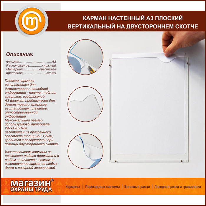 Карман настенный А3 плоский вертикальный на двустороннем скотче