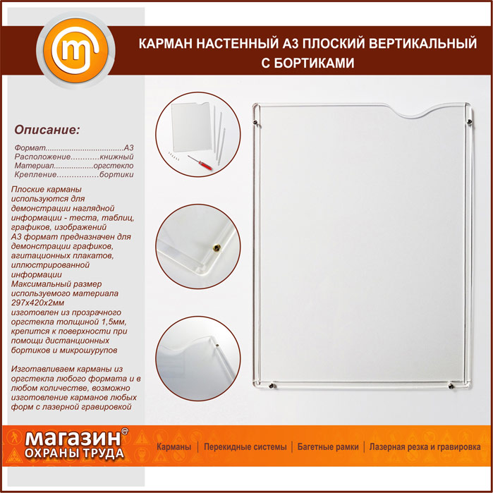 Карман изготовлен из прозрачного оргстекла толщиной 1,5 мм, крепится к поверхности при помощи дистанционных бортиков и микрошурупов