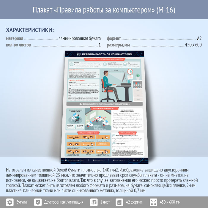 Плакат «Правила работы за компьютером» (М-16, ламинированная бумага, А2, 1 лист)