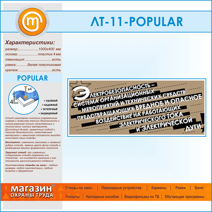 Превью - лишь типовой макет, отправная точка - пример того, как может выглядеть будущий стенд. По факту же практически каждый стенд делается индивидуальным. Мы можем оформить стенд в вашем корпоративном стиле (включая цвета, фоновое изображение, шрифты и логотип), изменить заголовок, добавить рубрики, разместить на нем рекламную информацию. Мы изготавливаем стенды на заказ любого размера и комплектации, c любым дизайном и оформлением.