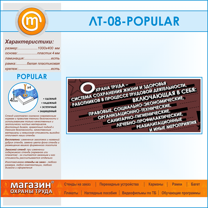 Превью - лишь типовой макет, отправная точка - пример того, как может выглядеть будущий стенд. По факту же практически каждый стенд делается индивидуальным. Мы можем оформить стенд в вашем корпоративном стиле (включая цвета, фоновое изображение, шрифты и логотип), изменить заголовок, добавить рубрики, разместить на нем рекламную информацию. Мы изготавливаем стенды на заказ любого размера и комплектации, c любым дизайном и оформлением.