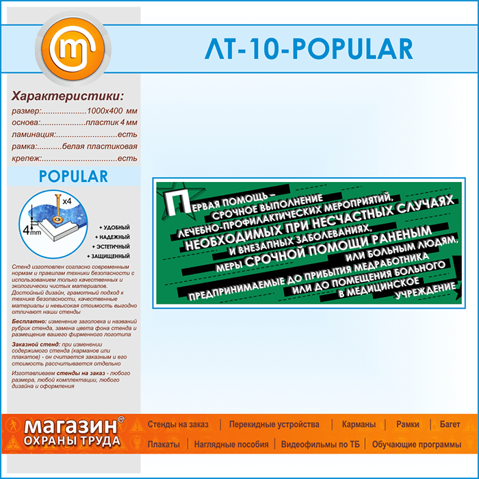 Предлагаем Вашему вниманию стенд с лозунгом «Первая помощь — срочное выполнение лечебно-профилактических мероприятий, необходимых при несчастных случаях и внезапных заболеваниях, меры срочной помощи раненым или больным людям, предпринимаемые до прибытия медработника или до помещения больного в медицинское учреждение»