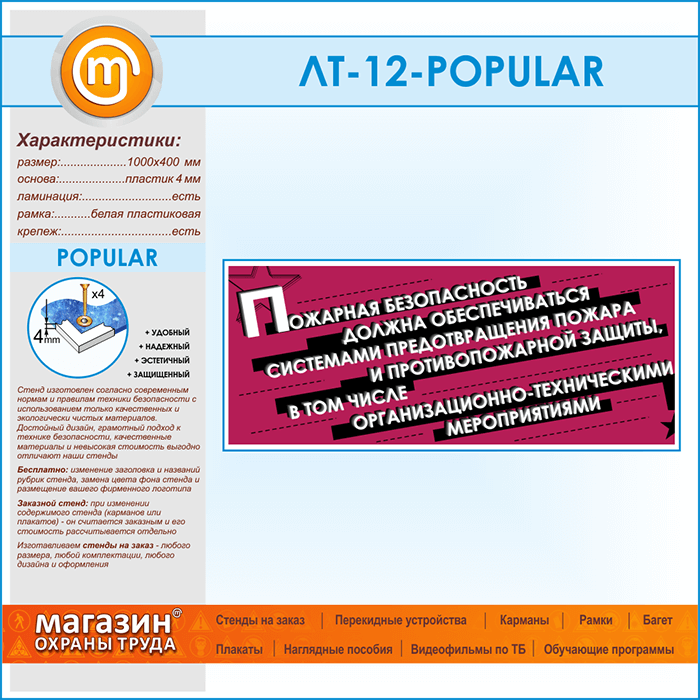 Превью - лишь типовой макет, отправная точка - пример того, как может выглядеть будущий стенд. По факту же практически каждый стенд делается индивидуальным. Мы можем оформить стенд в вашем корпоративном стиле (включая цвета, фоновое изображение, шрифты и логотип), изменить заголовок, добавить рубрики, разместить на нем рекламную информацию. Мы изготавливаем стенды на заказ любого размера и комплектации, c любым дизайном и оформлением.